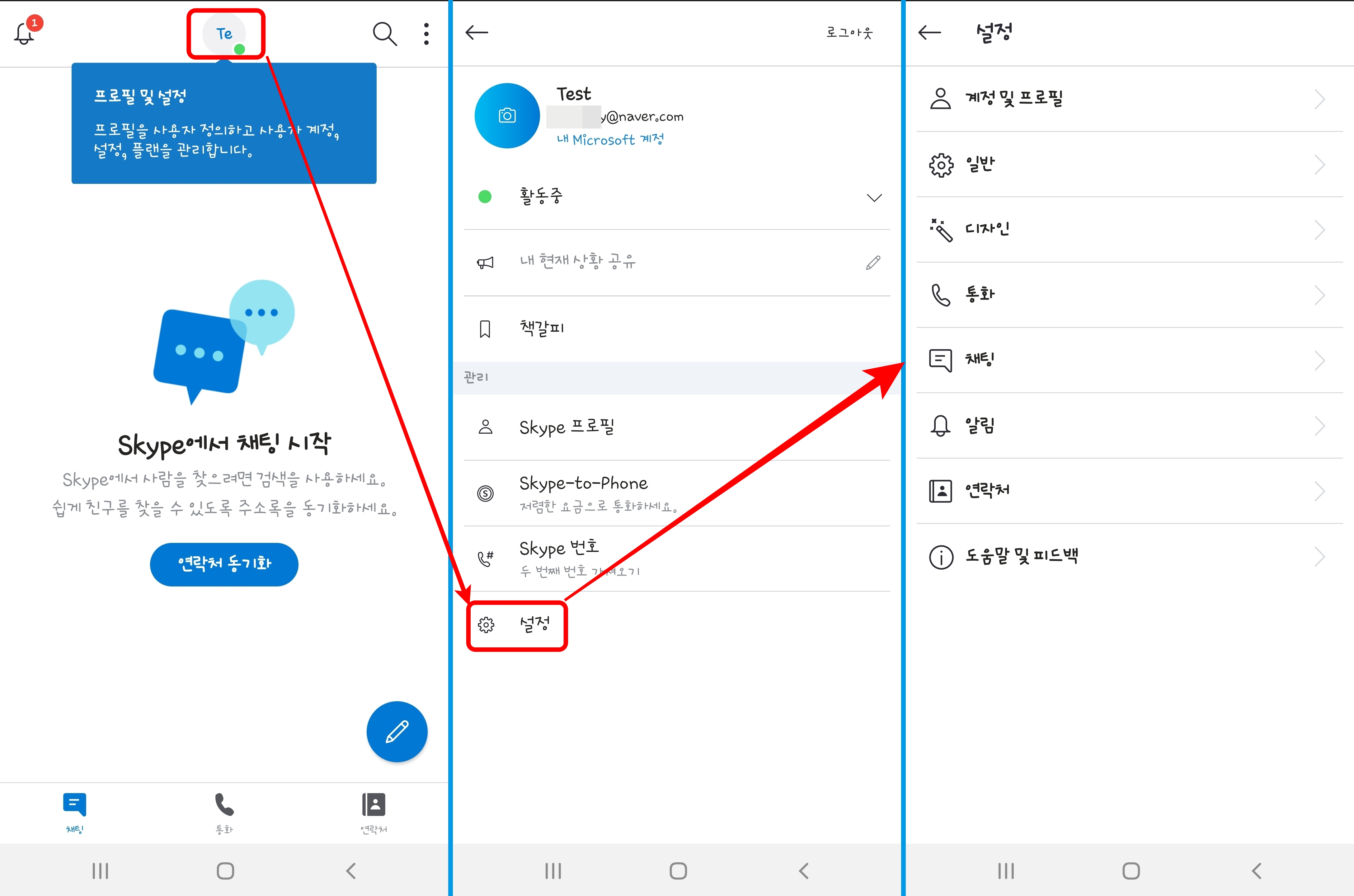[계정 및 프로필, 디자인, 통화, 채팅, 알림, 연락처]등에 대한 디테일한 기능을 설정할 수 있다.