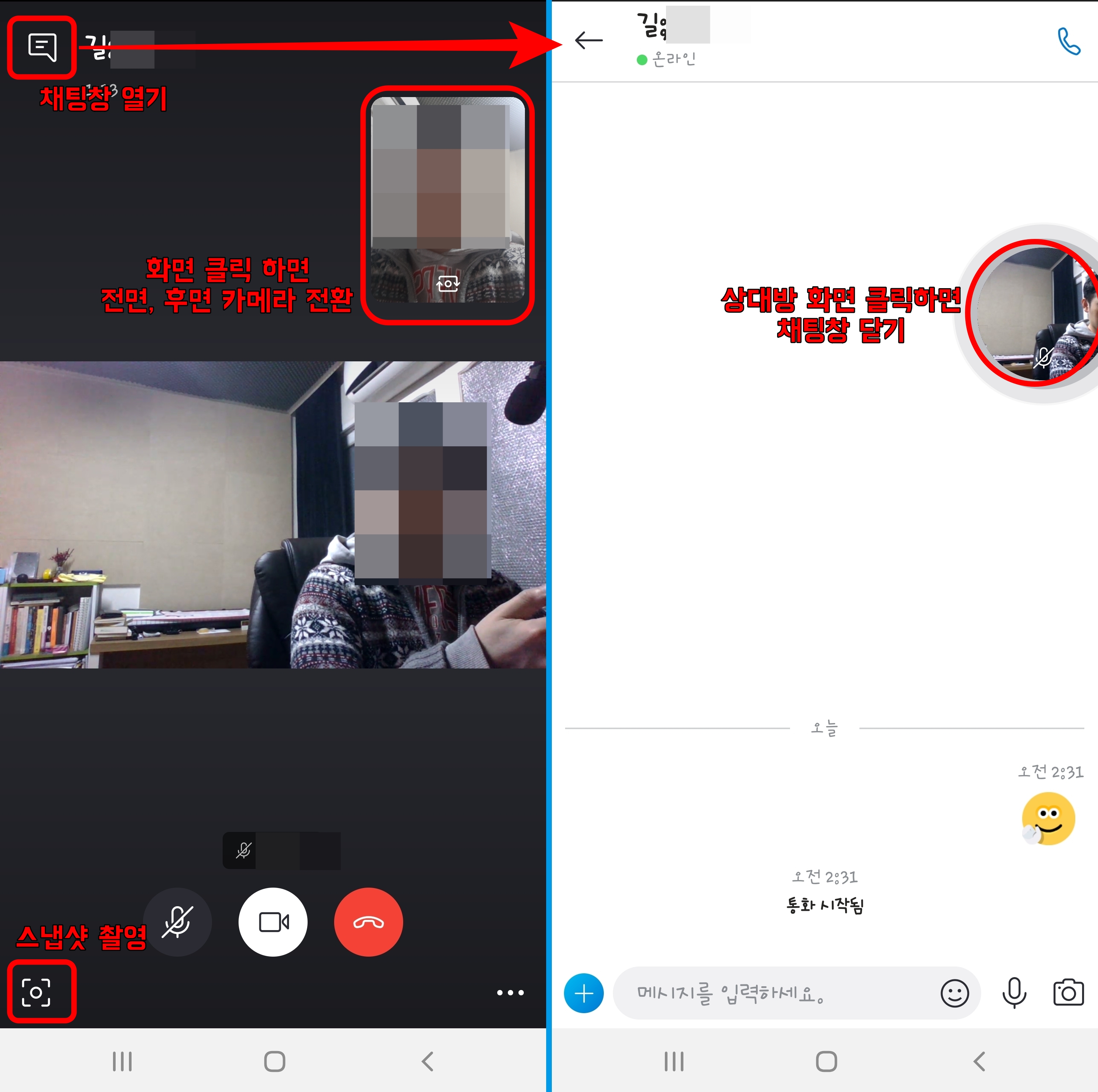 친구와 통화 중일 때 자신의 화면을 클릭하면 전면, 후면 카메라로 전환할 수 있고, 왼쪽 하단의 아이콘을 클릭하면 스냅숏을 촬영할 수 있다.
