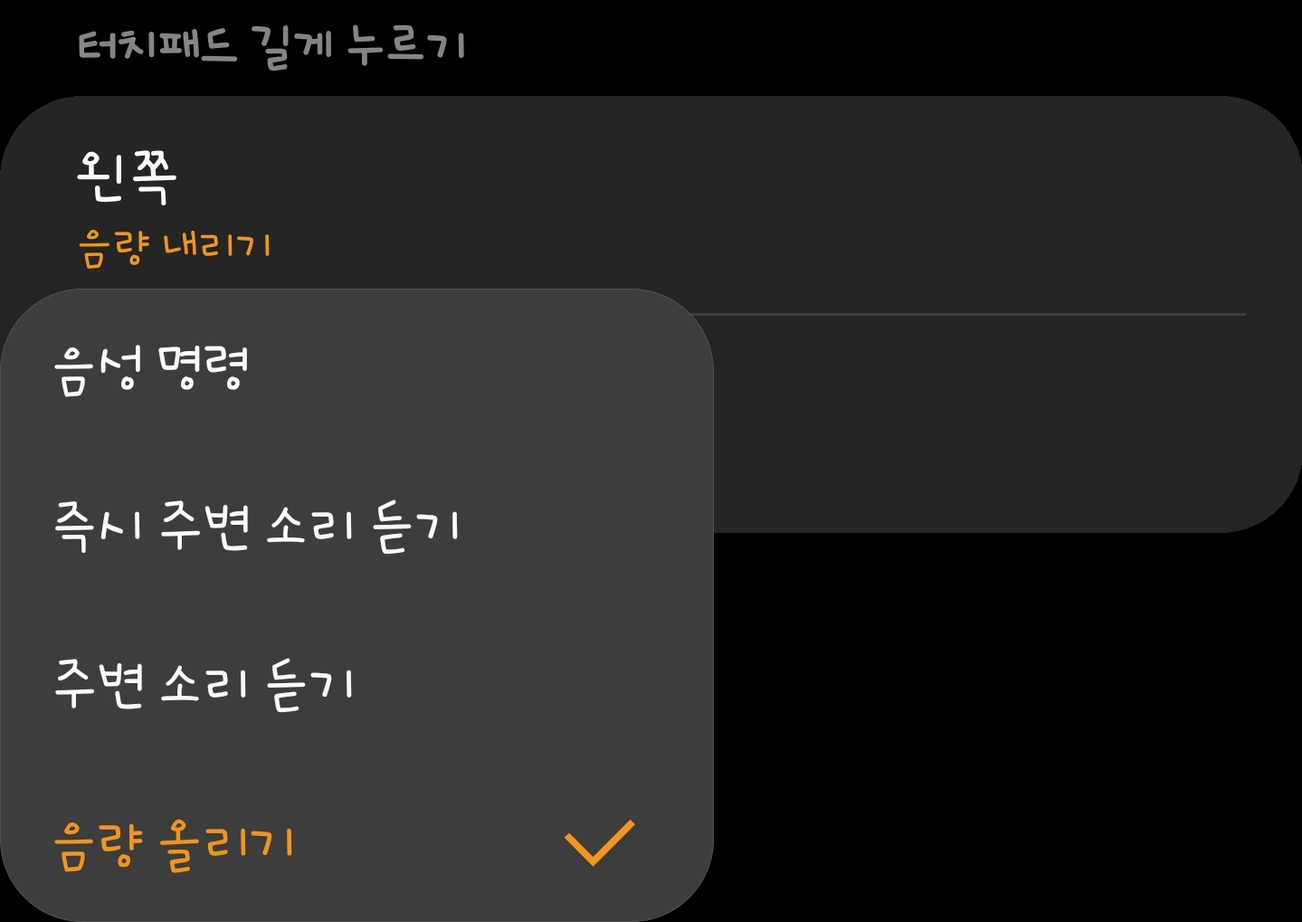 설정할 수 있는 기능으로는 '음성 명령, 즉시 주변 소리 듣기, 주변 소리 듣기, 음량 올리기, 음량 내리기'가 있다.