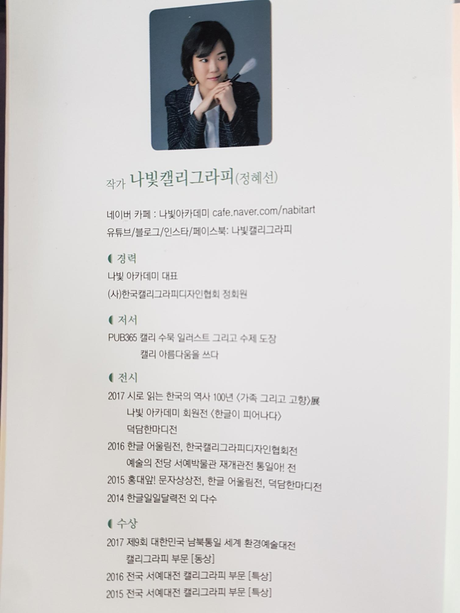 이 책의 저자는 나빛 캘리그래피를 운영하고 있으며, 일반 펜뿐만 아니라 붓으로 하는 캘리그라피를 전문으로 하고 계신다.