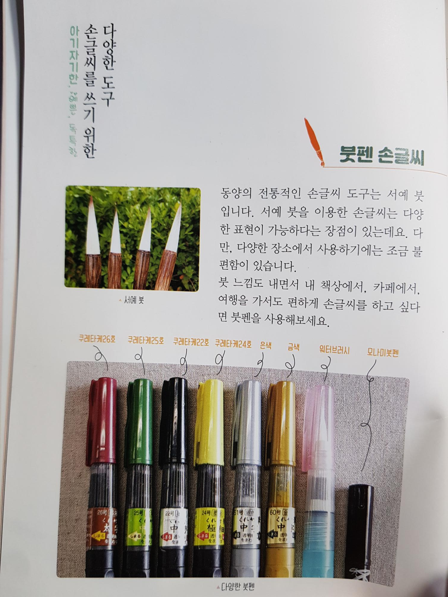 붓펜에 대한 설명 경우 쿠라타게 붓펜, 모나미 붓펜, 아카시아 색 붓펜 등 브랜드마다의 장단점을,