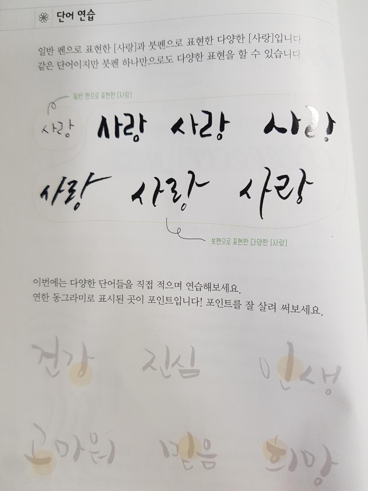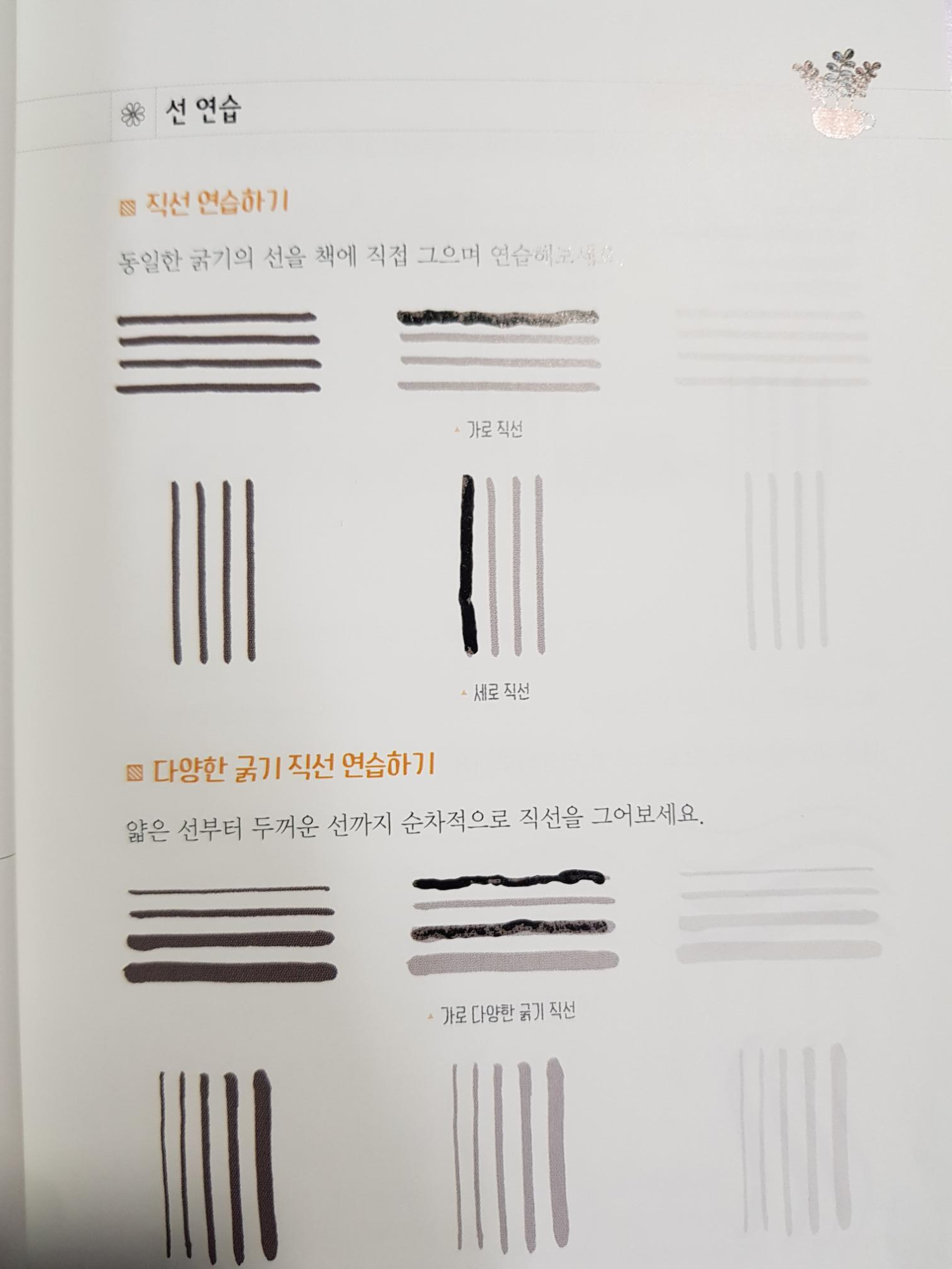 그리고 장점은 책에 바로 연습을 할 수 있게 굵기까지 상세하게 밑그림이 그려져 있다는 것이다.